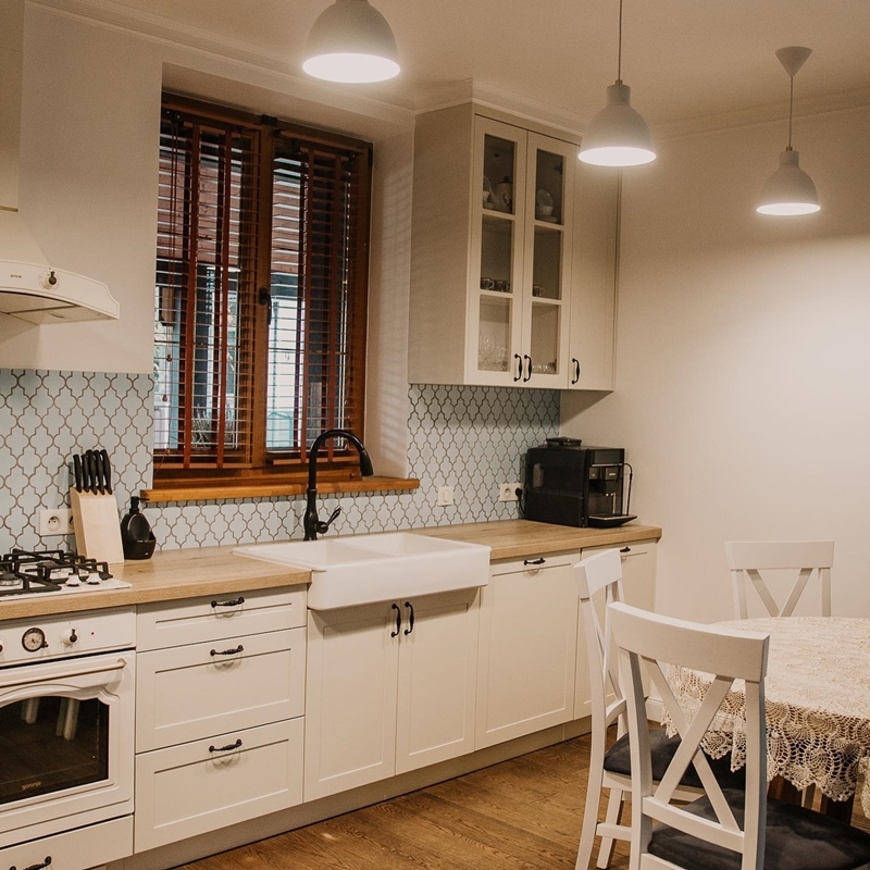 W aranżacji kuchni błękitne, dekoracyjne płytki zostały zestawione z białą zabudową z frezowanymi frontami. Aby połączyć funkcjonalność ze spójną estetyką, w aranżacji wykorzystano stylizowany sprzęt AGD oraz wykończenie inspirowane stylem angielskim – między innymi w formie uchwytów. W jasnym, klasycznym pomieszczeniu udało się także zmieścić okrągły stół jadalniany z krzesłami.