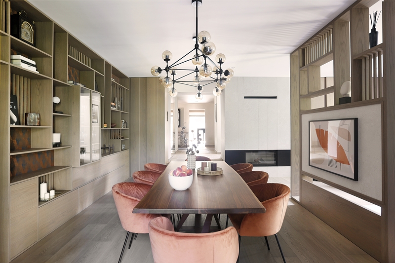 Rozgraniczenie przestrzeni podkreślają również kolory. W przestrzeni jadalnianej, której lwią część stanowią obszerny stół z drewnianym blatem oraz wygodne krzesła kubełkowe, dominuje kompromis brązu, miedzi oraz pomarańczy. To połączenie kolorystyczne można podziwiać zarówno na tapicerce foteli, jak i w dekoracyjnych dodatkach, takich jak świece na stole czy nowoczesna grafika na ścianie.