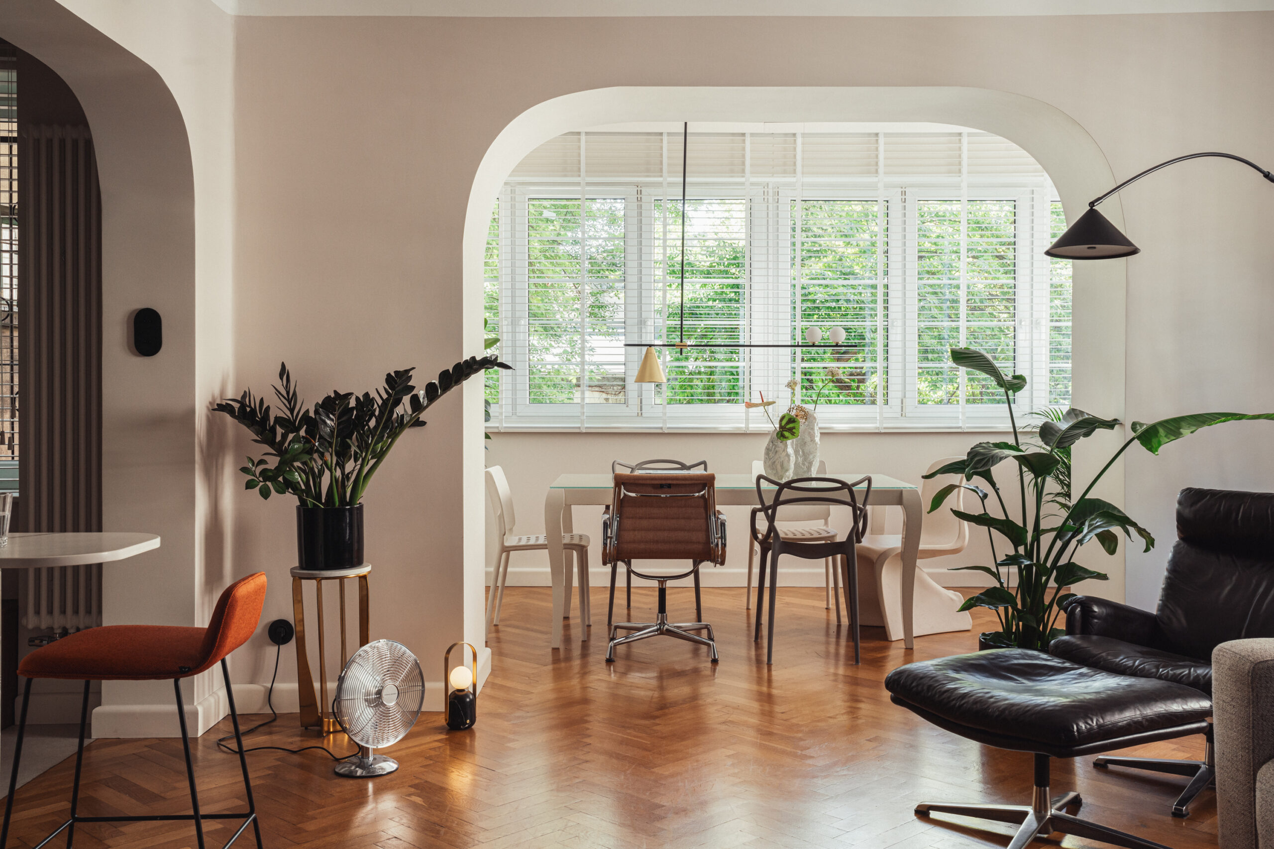 W salonie uwagę przyciąga przestronny fotel vintage z podnóżkiem, wykonany ze skóry, który tworzy strefę komfortu i relaksu. Wygięta, minimalistyczna lampa podłogowa od Aromas to doskonały przykład równowagi pomiędzy funkcjonalnością a designem. Całość dopełniają designerskie dodatki. Warto również uwagę na część ze stołem jadalnianym, a dokładnie na krzesła – każde jest inne. Skąd ten pomysł?