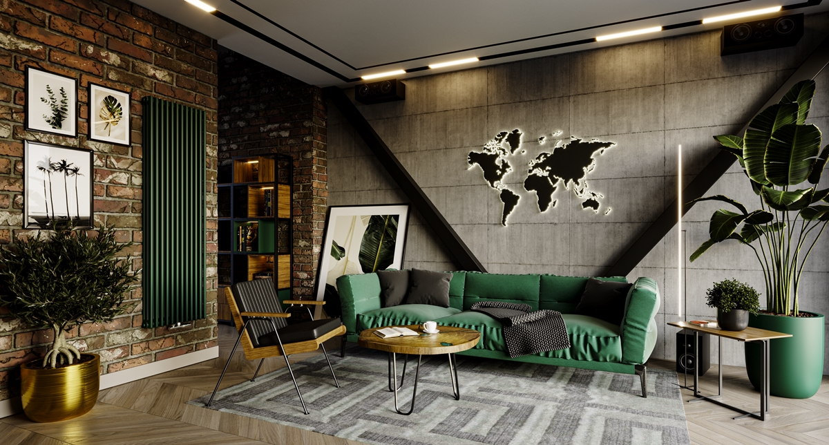 Grzejnik może być również subtelnie zdobnym akcentem w salonie, czego dowodem jest industrialna aranżacja, której ożywiającym składnikiem jest butelkowa zieleń, będąca motywem przewodnim kompleksu wypoczynkowego, ale również kolorystyczną odsłoną Columnusa. Nie sposób nie zauważyć, że pionowa konstrukcja tego modelu doskonale koresponduje z oparciem loftowego fotela.