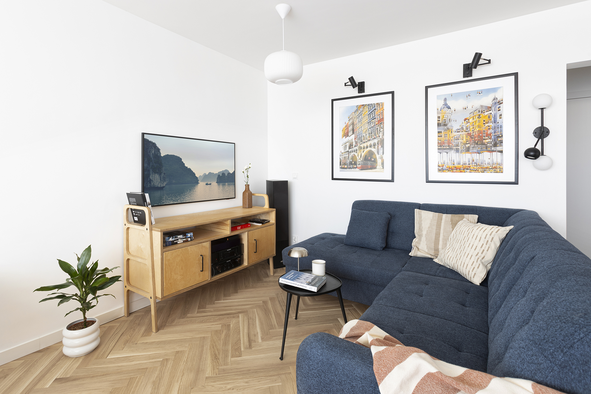 Na malowniczych Starych Bielanach, w otoczeniu klimatycznych uliczek i urokliwych parków, powstało wyjątkowe wnętrze, które harmonijnie łączy funkcjonalność z osobistym charakterem. Mieszkanie zaprojektowane dla czteroosobowej rodziny przeszło spektakularną metamorfozę. Stało się przestrzenią pełną światła, inspiracji i przemyślanych rozwiązań, gdzie kolorystyka inspirowana morzem spotyka się z ciepłem naturalnych materiałów.