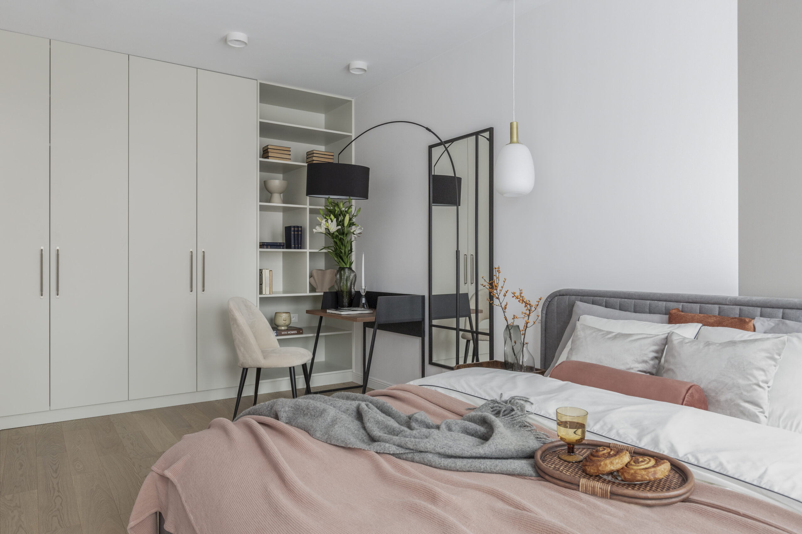 Z salonu wchodzimy do części prywatnej. Całą jedną ścianę sypialni zajmuje szafa, której ostatni moduł zaprojektowany został jako otwarty regał. Na półkach oprócz dekoracji, znajdą zapewne miejsce materiały potrzebne do pracy – książki i segregatory. Tuż obok – znak dzisiejszych czasów – miejsce przeznaczone na home office. Zamiast lampy biurkowej projektantka zaproponowała lampę podłogową, która swoim ramieniem obejmuje biurko i znów, co charakterystyczne dla tego projektu, naturalnie wydziela kolejną strefę do życia. Łóżko Scandi Sofa posiada tapicerowany welurem zagłówek, który wzmacnia wrażenie intymnej przytulności. Zamiast lampek nocnych, po dwóch stronach łóżka wiszą szklane, bardzo dekoracyjne oprawy marki Nordlux. – Po pomalowaniu