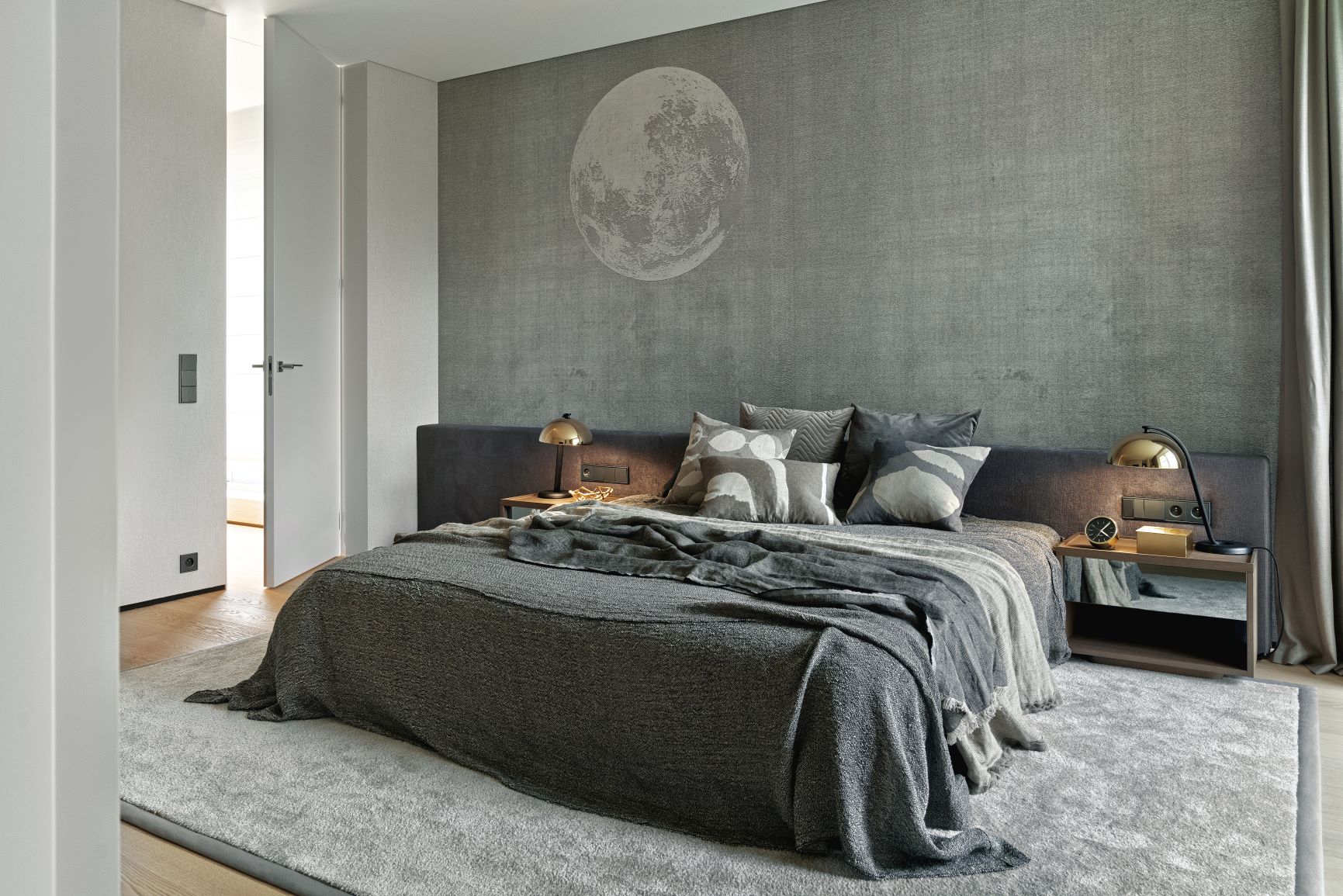 Master bedroom, sypialnia gospodarzy to wnętrze mieniące się wszystkimi odcieniami szarości, otulone naturalnymi tkaninami i fakturami. Ścianę u tapicerowanego wezgłowia łózka zdobi tapeta włoskiej marki Wall & Deco. Z sypialni wchodzimy do także utrzymanej w szarej tonacji łazienki. Wzrok przyciąga perłowa mozaika marki Mutina. Ciekawy efekt daje motyw koła, który dominuje we wnętrzu. Kształt lustra powtarzają oprawy lamp Cosmos firmy Vibia.